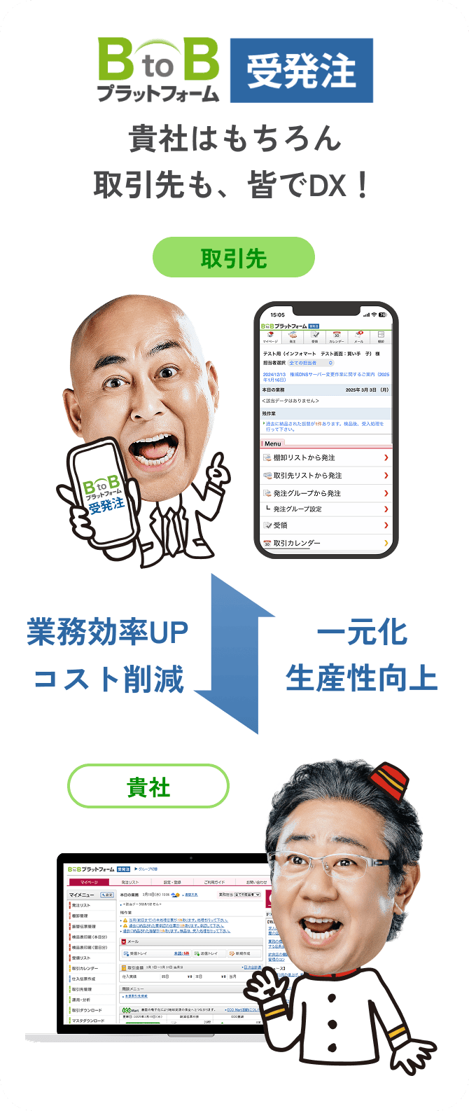「BtoBプラットフォーム 受発注」は、クラウド型受発注システムです。発注業務の効率化やコスト削減に加え、⽉次決算の早期化を実現。さらに、棚卸発注機能や⽀払管理機能により、業務負担の⼤幅な軽減が可能です。