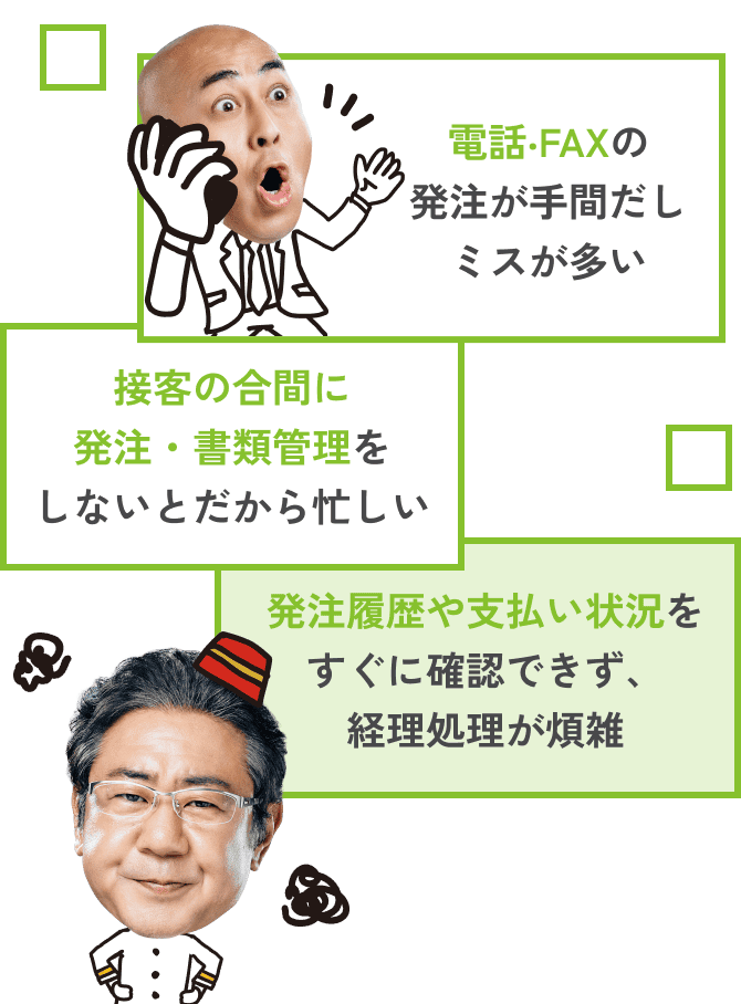 ⼈⼿不⾜や属⼈化を解消発注から請求までをデジタルで⼀元管理。棚卸管理もシステムで⾏えるため、在庫状況の把握が迅速にでき、ミスを防ぎ少⼈数でも業務を効率的に進められます。さらに集計した当⽉の取引⾦額を取引先に承認依頼し、取引先が承認すれば⽀払⾦額が確定します。これにより、接客やおもてなしに集中できる環境を実現します。