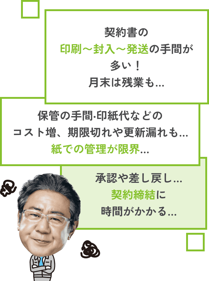 電⼦契約書に切り替えることで、印刷・押印・製本・収⼊印紙を購⼊して貼り郵送する⼿間・コストが不要に。再送もシステム上で可能だから、