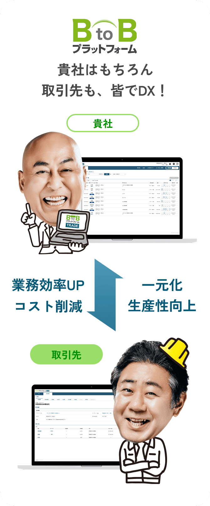 「BtoBプラットフォーム」は、⾒積〜請求業務で発⽣する様々な書類をまとめてデジタル化し、クラウドで⼀元管理。⾯倒な書類業務のムダをなくし、⼤幅な業務効率化を実現します。さらに、査定や⼯事原価⼊⼒、⽴替⾦・保留⾦の処理など、建設業ならではの請求書作業に対応した機能も提供しています。